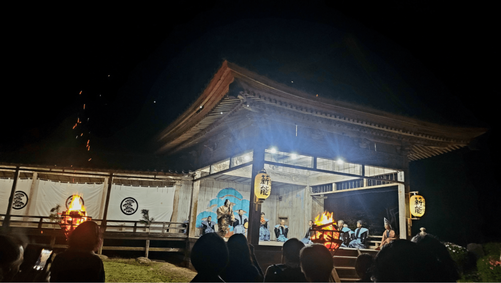 That evening, we attended a Noh performance at Ushio Shrine—a highlight that Cole had been especially looking forward to. With a history of over 1,200 years, this performance is a sacred offering held on the eve of the village festival. The torch-lit stage created a mystical atmosphere, allowing us to experience yūgen—the subtle, profound beauty unique to Japanese culture.