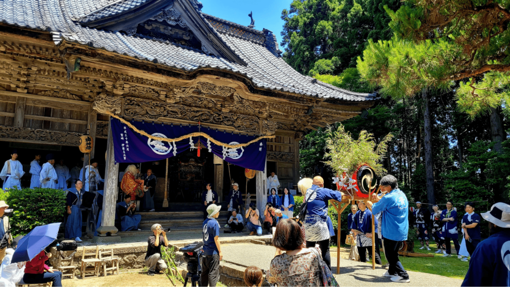 After that, we visited a festival in a friend’s village. From around 6 a.m. to 9 p.m., Oni-daiko (demon drumming) is performed at each household to pray for a good harvest and the village’s safety. This ritual also wards off evil and promotes good health. Villagers begin practicing months in advance, and the event strengthens community bonds.